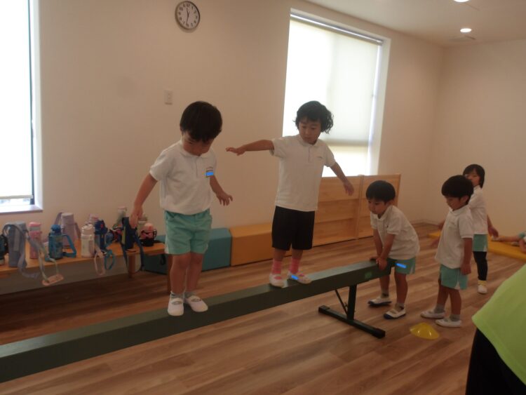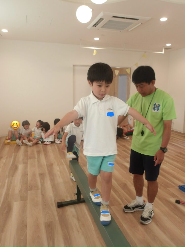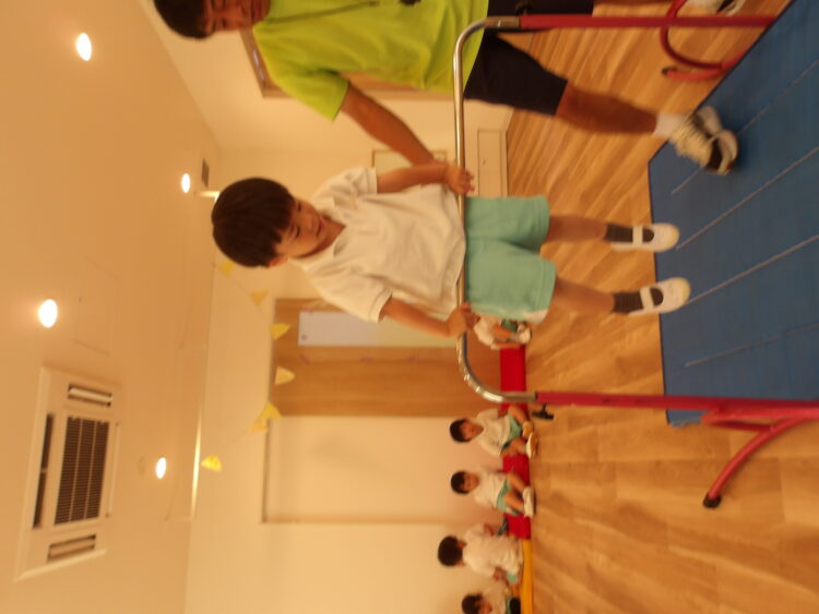 平均台ではカタツムリみたいに平均台に腹這いになって手と足の力で進んだり、手を広げてバランスを取って渡ったりと頑張っていました最後は鉄棒! 鉄棒ではツバメのポーズで鉄棒に登ったり、ロープの補助で逆上がりを頑張ったりと真剣な表情でやっていました!今日も元気に遊んで過ごした子ども達でした