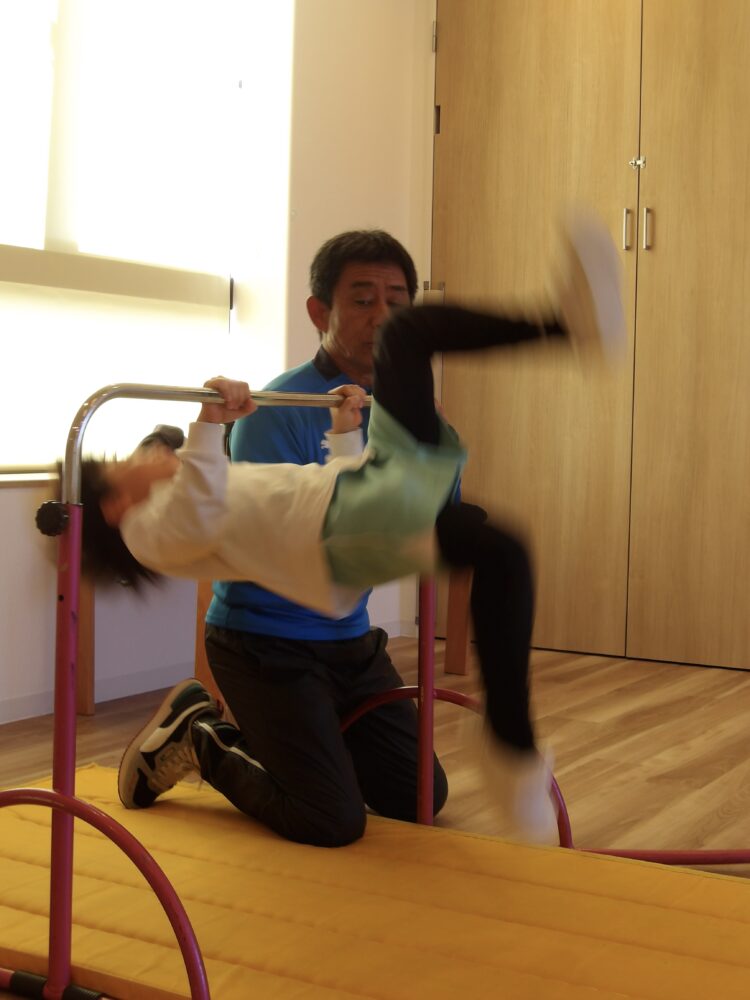 鉄棒の握り方、体の位置、足の上げ方などを細かく教えてもらいながら挑戦しました。