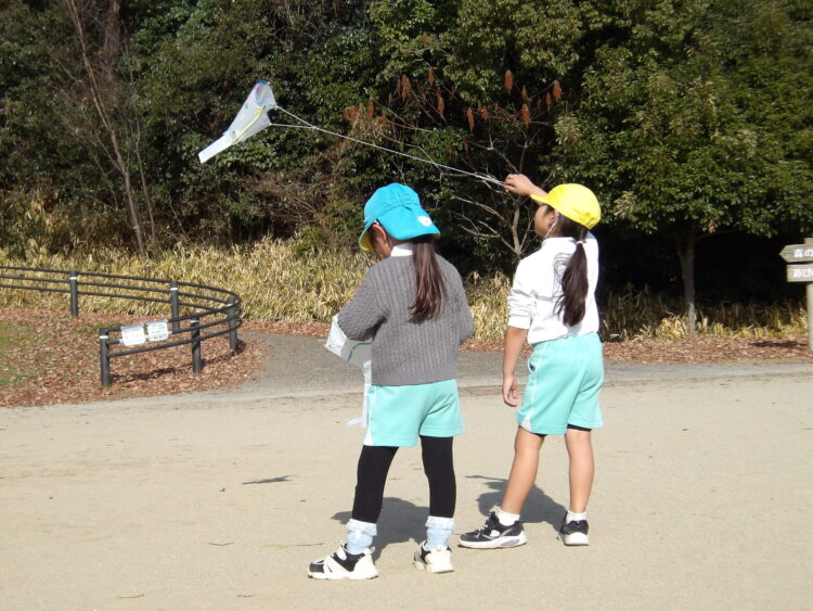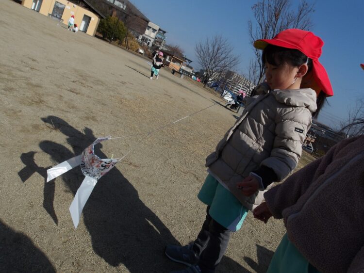 友だちの姿を見たり、実際にあそんでみる中でどうしたら凧が揚がるのかを考えたりコツを掴んだりしていきましたよ。