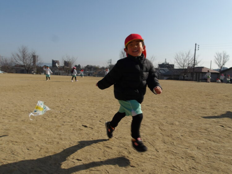 あそんでいるうちに風が吹くと立ったままでも凧が揚がることに気付き、「走ってないのに勝手にとんだ!」と驚く姿も見られました。