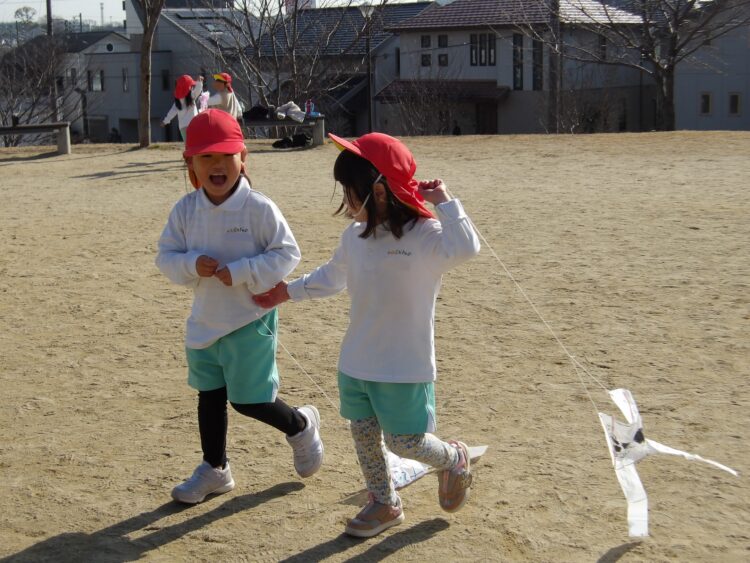 仲良しの友だちと手を繋いで一緒に走りながら凧を揚げる姿も☺️