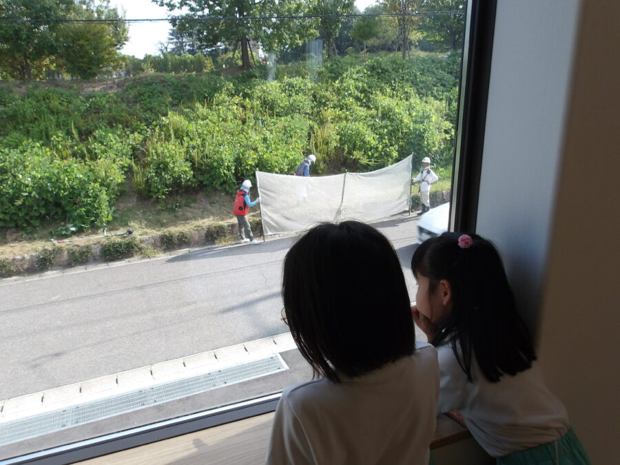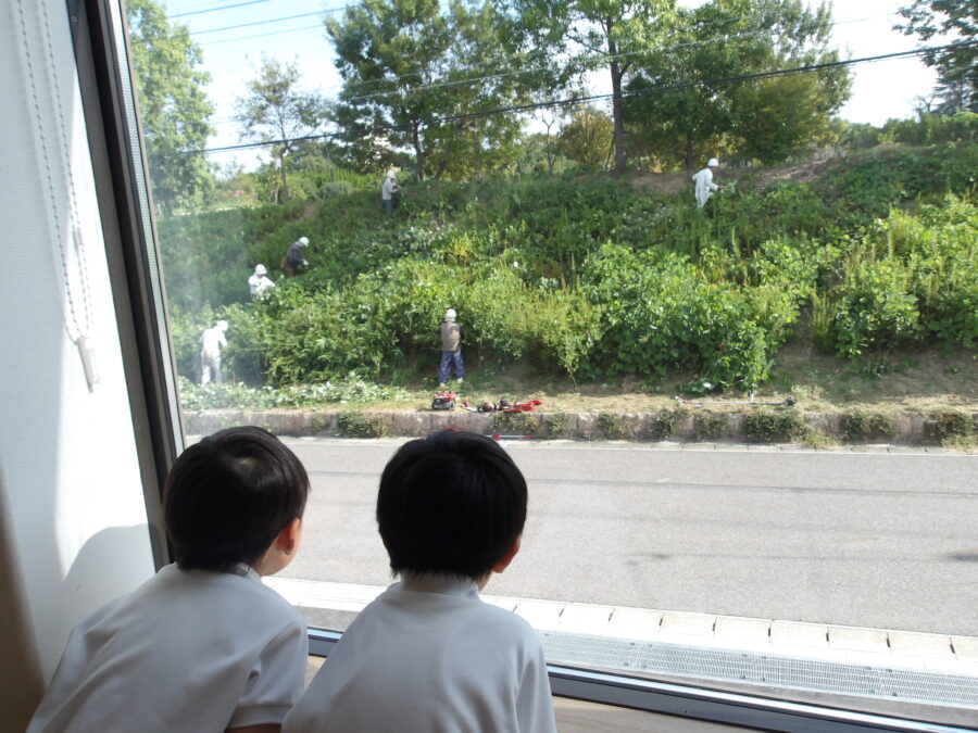 今日は園舎の向かいで作業員さんたちが草刈りをしていました。