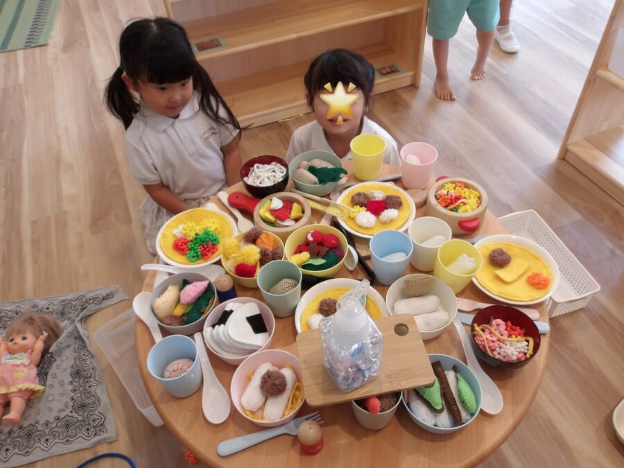 「先生来て〜」と言われてままごとコーナーへ向かうと料理がいっぱい!