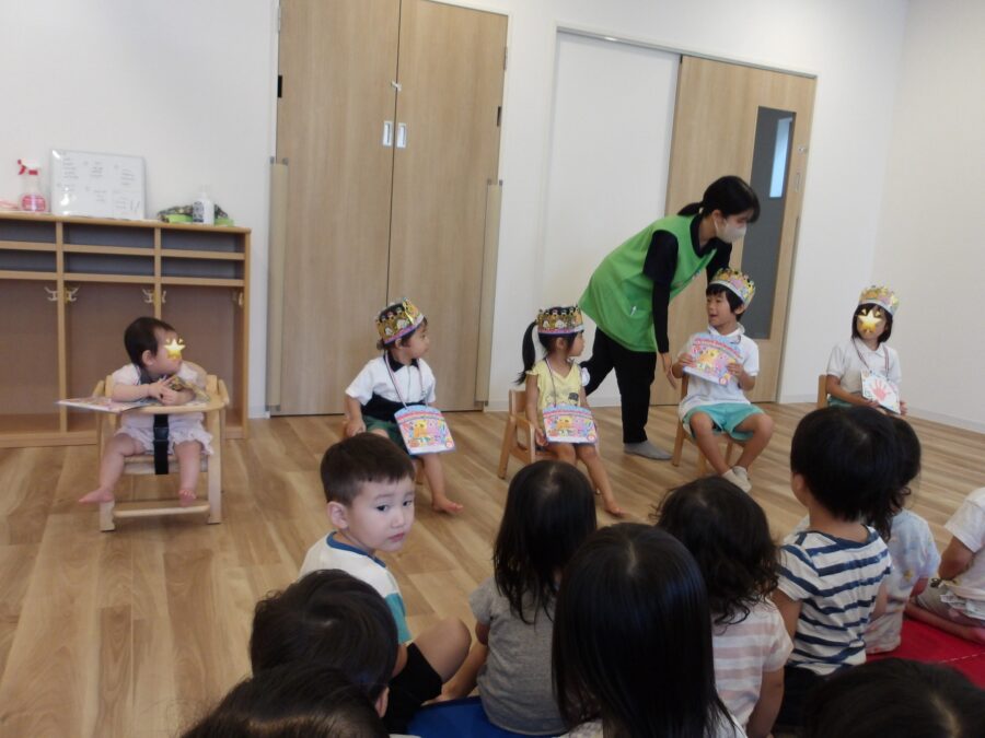 0歳児クラスから5歳児クラスまで、それぞれのクラスのお友だちをみんなでお祝いしましたよ。