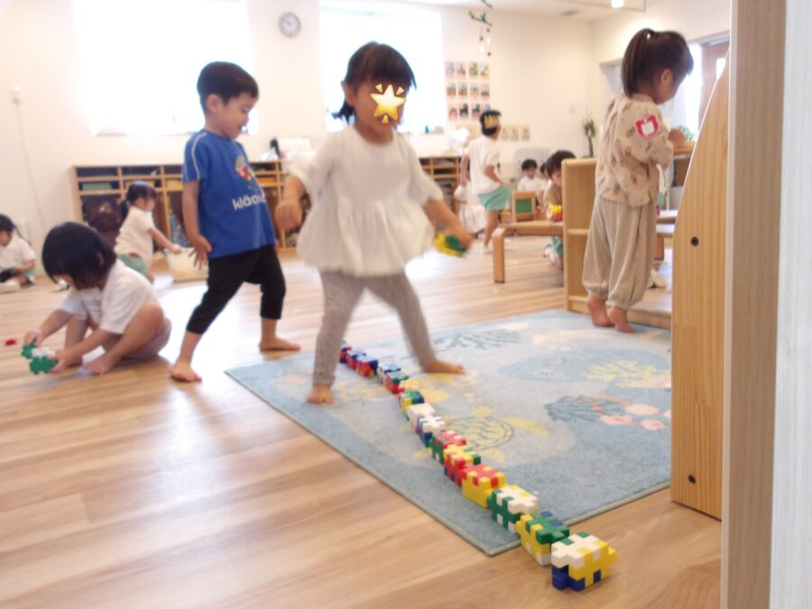 友だちと協力して完成させたことを保育者に教えてくれた後、自分たちでできたことが嬉しくて飛び跳ねて喜んでいました😊