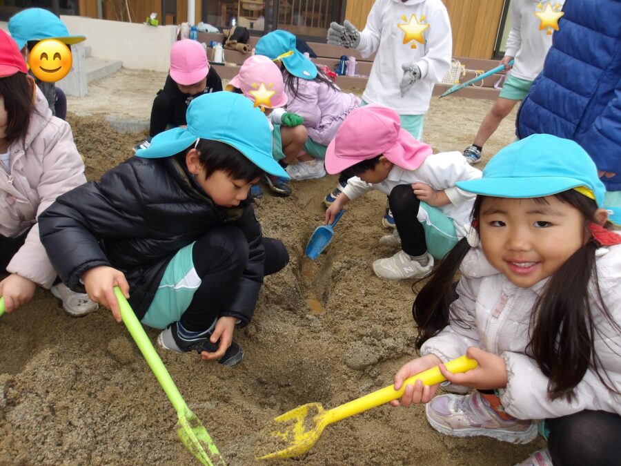 まずはお砂場で遊ぶぞー! お友達と共同作業で工事現場みたいに楽しんでいました👷
