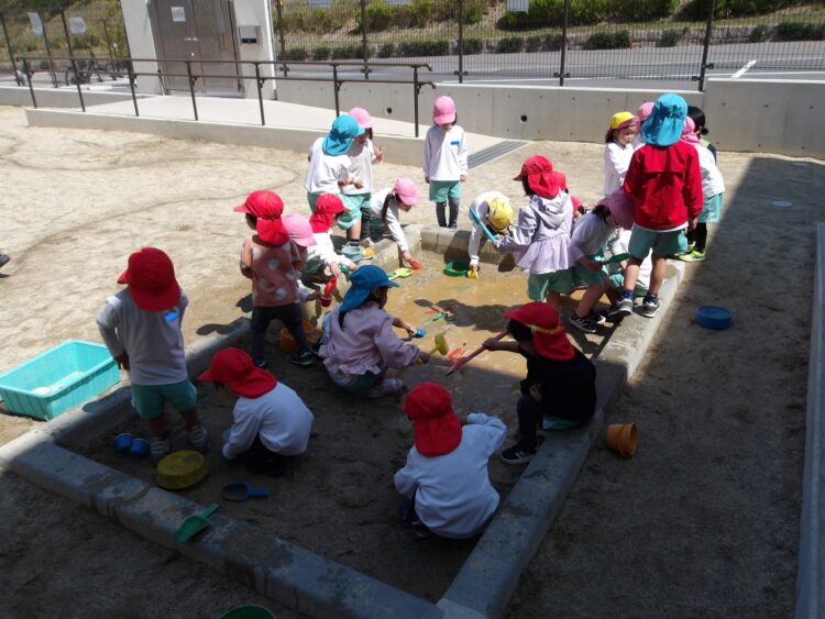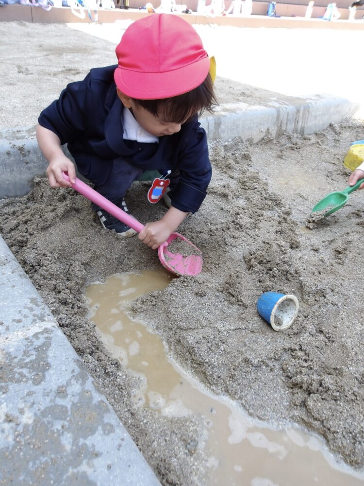 お砂場でお水の道を作る子も! 沢山掘ると大きな川が出来ていました!