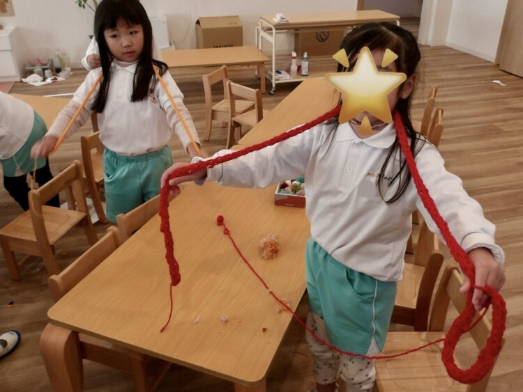 お部屋では毛糸あそびをおこないました。指編みや、ポンポン作りをしましたよ。