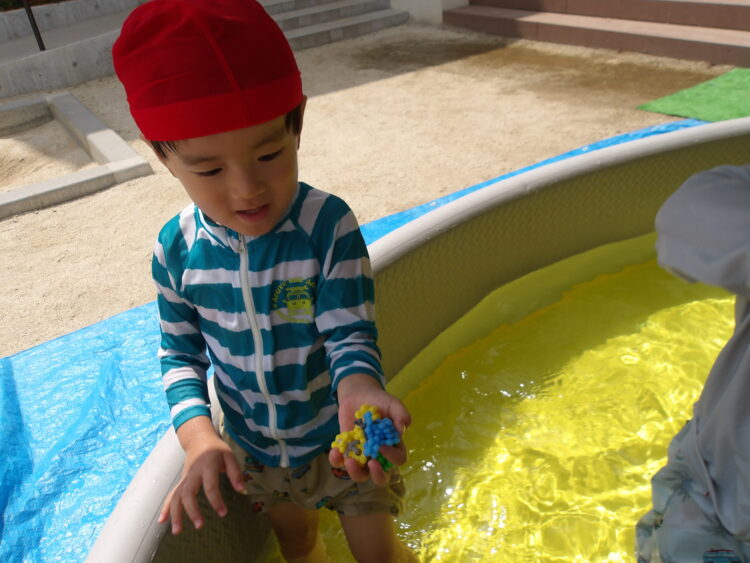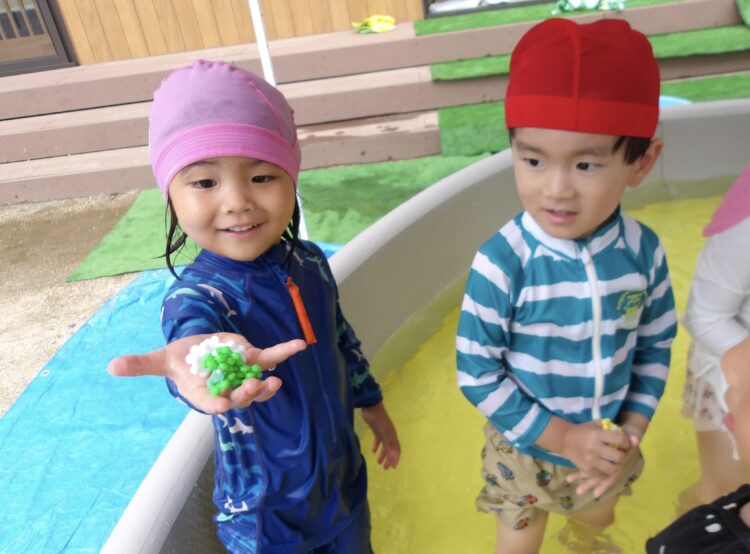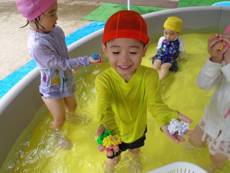 ぽちゃん、とおはじきが落ちる音を聞いて、「あ、今僕の近くに落ちた☺️」とどこに落ちたか予想したり、拾うのを楽しみにしていました。