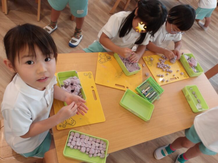 そら組がプールあそびをしている頃、にじ・たいよう組は室内であそびました。