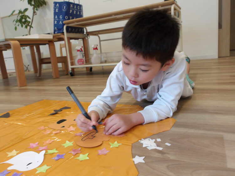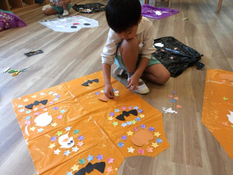 はさみに意欲的な子が多く、保育者が用意した素材を貼るだけで無く、「自分でコウモリ切ってみたい」「自分でおばけ描いて、自分で切る!」と自分でやってみようとする子が多く見られました。