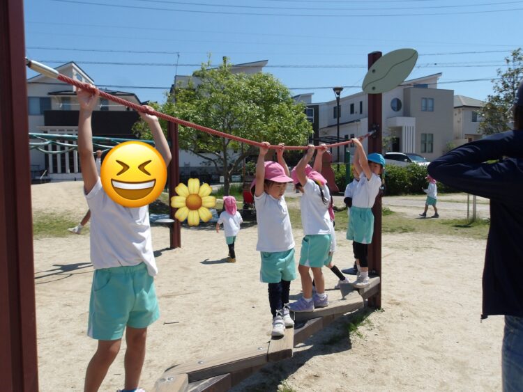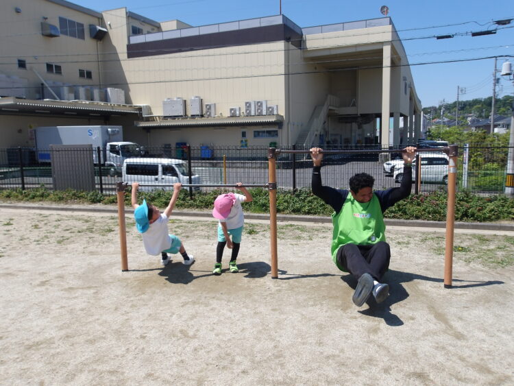 こっちでは先生と鉄棒勝負! どっちが長くぶら下がれるかな?