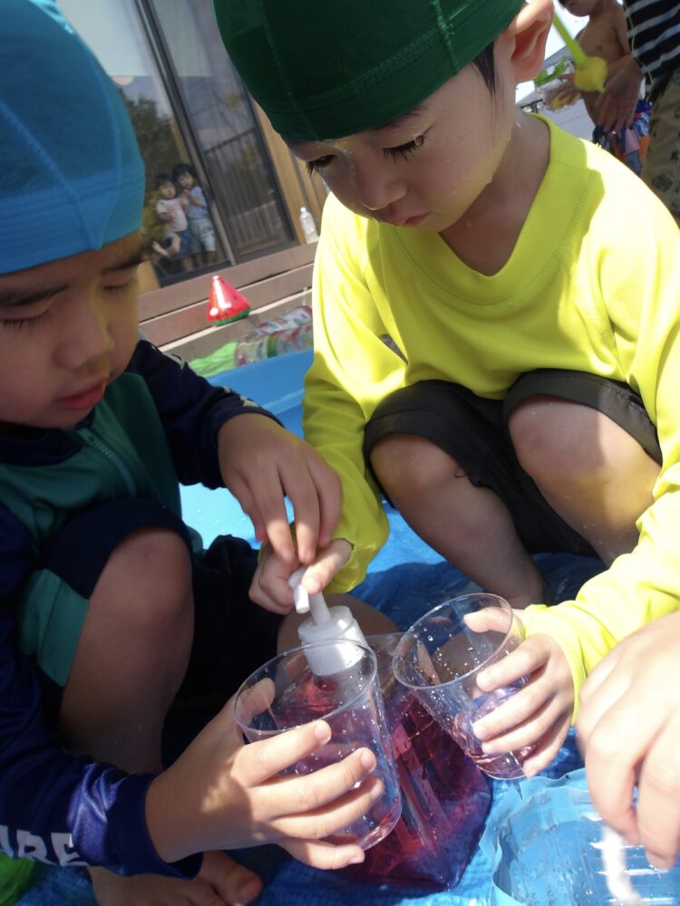 噴水に当たらないように真ん中に移動してみたりカップに水を溜めてみようとしたりと、工夫して遊んでいました😌