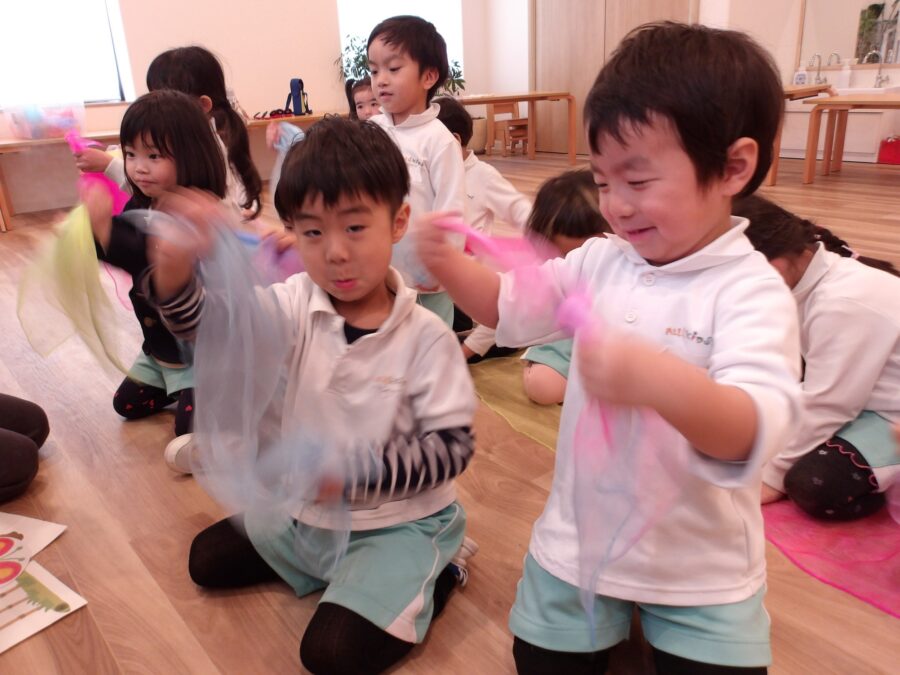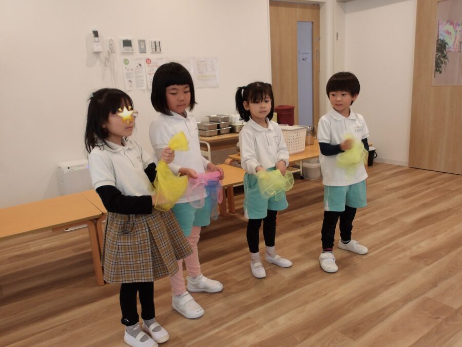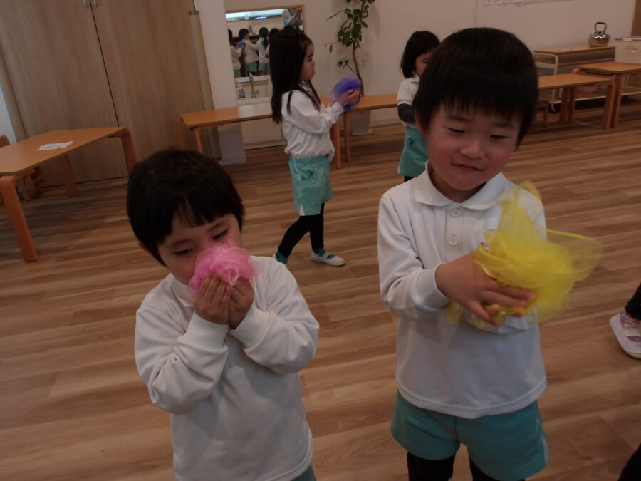 《ぱっとでた》という歌では、つくしやちょうちょ、お花などが出て来て、オーガンジーで表現しましたよ。