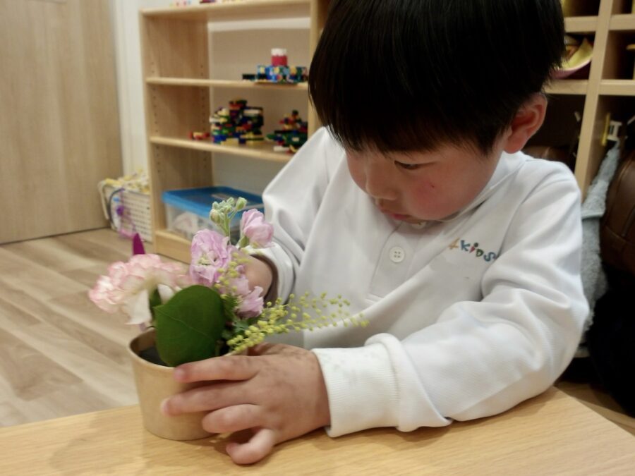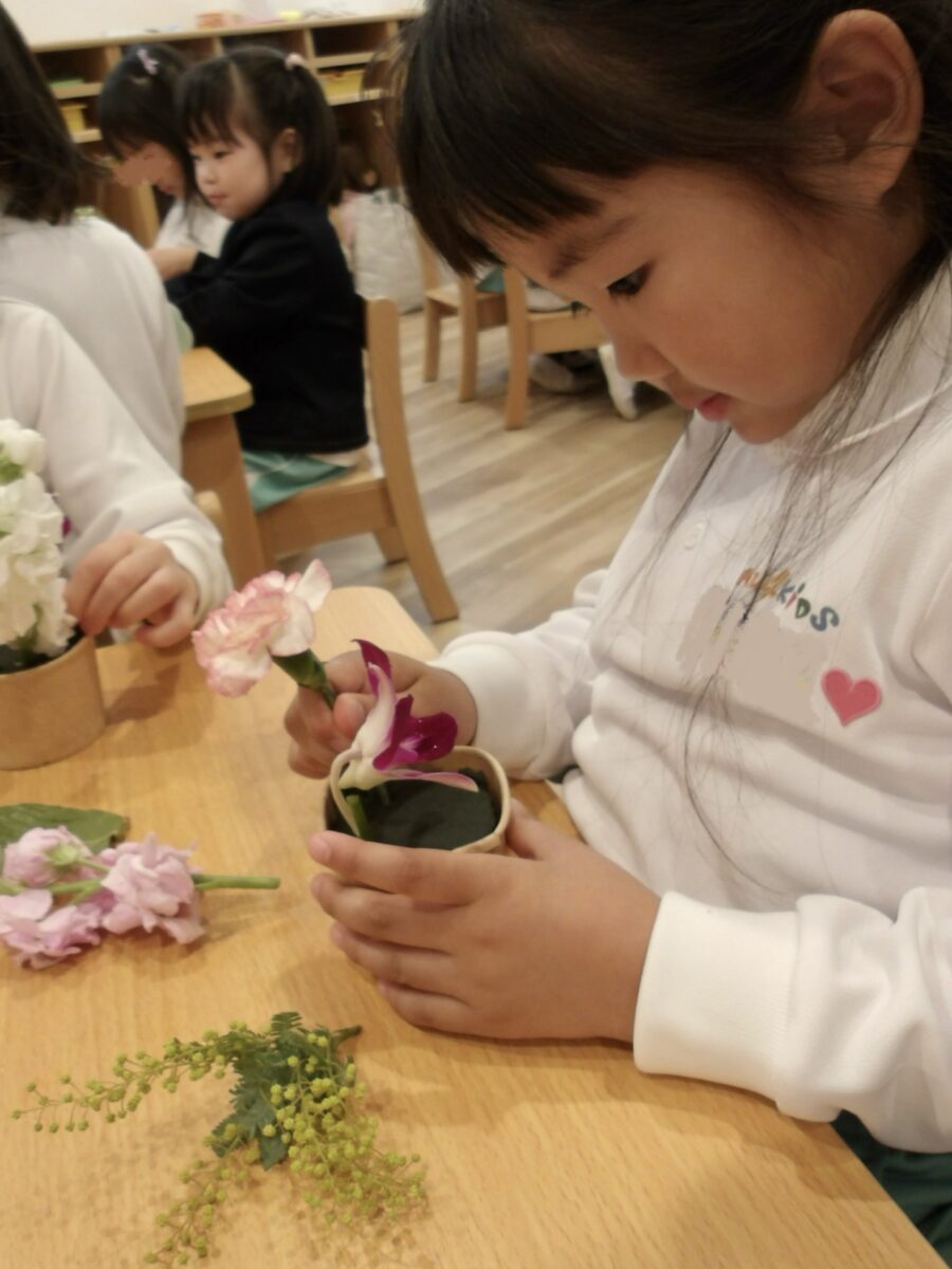 しばらく観察して、お気に入りのお花から真剣な表情でオアシスに刺していきましたよ。