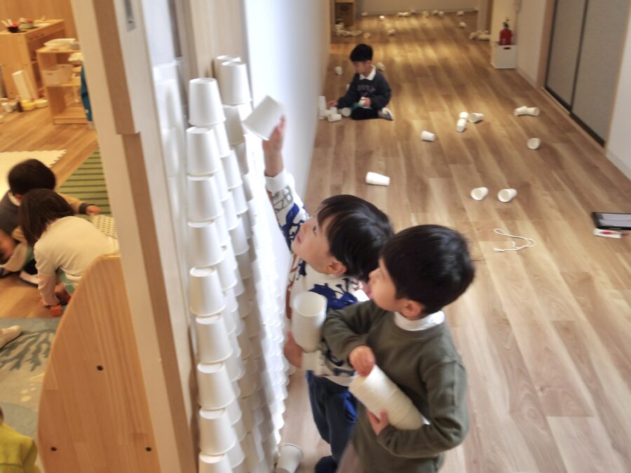 さて、うさぎ組は紙コップタワーの建設に集中する姿が。