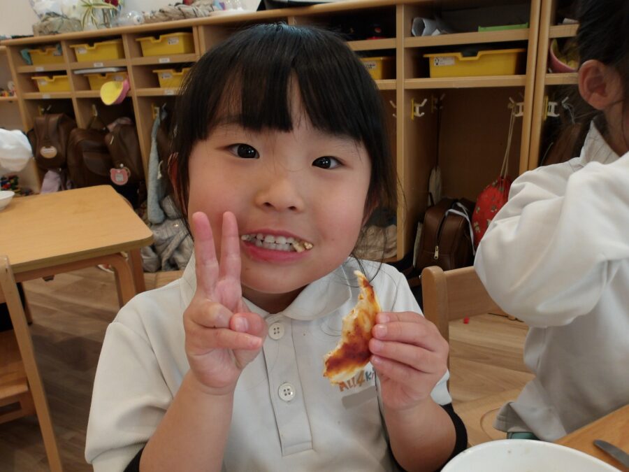 焼き始めたらいい匂いがしてきて、「もう完成した?」とホットプレートの中が気になる子どもたちでした。