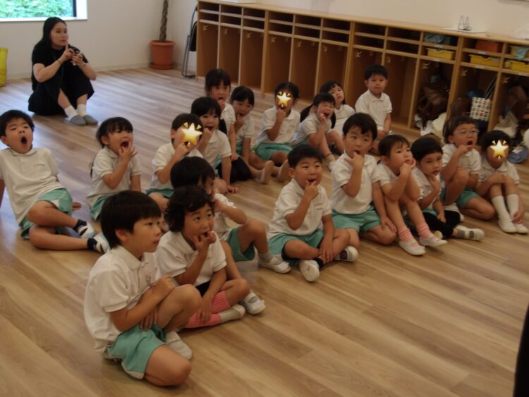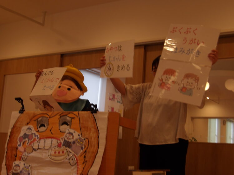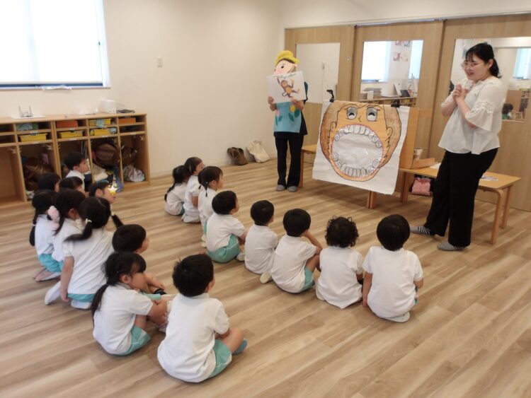 今日は長久手市の保健師さんと歯科衛生士さんによる歯科教室がにじ・たいよう組を対象に行われました。