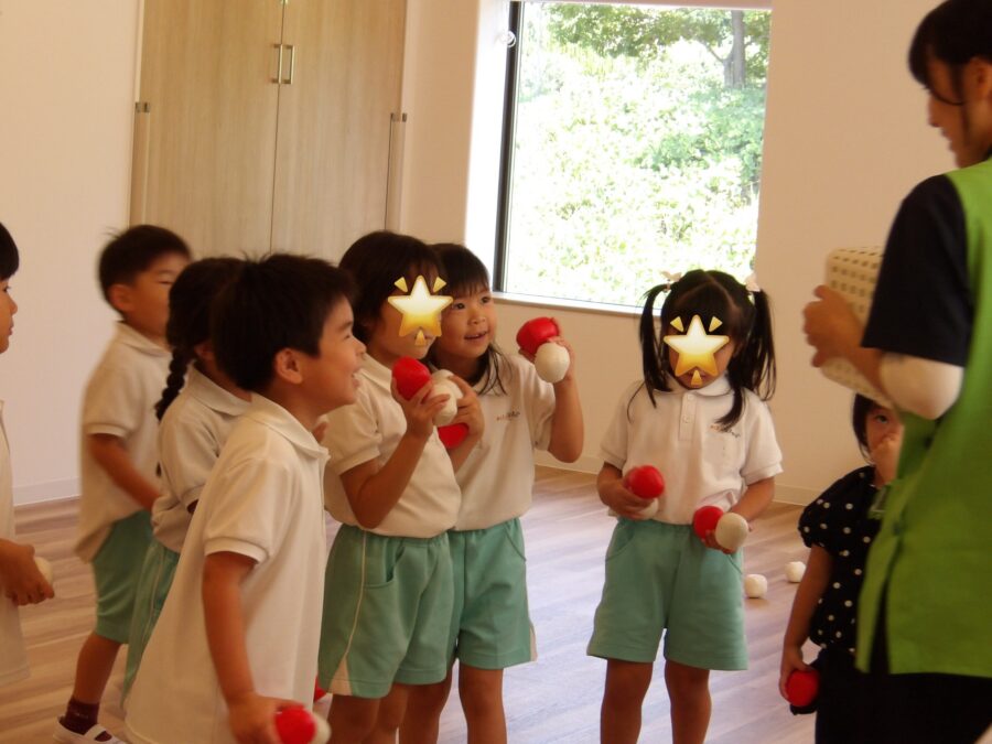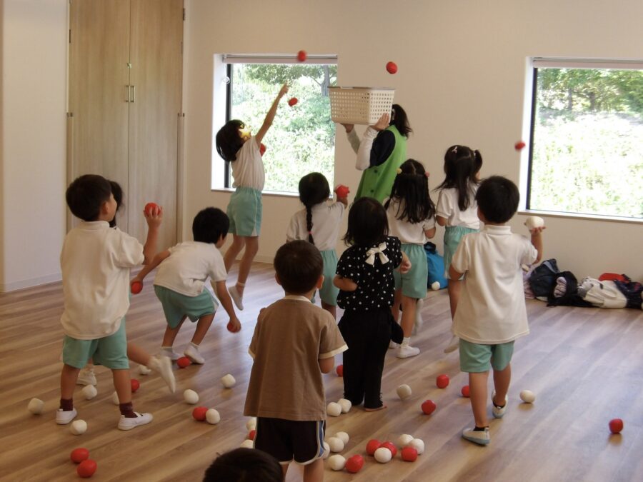 ルールは玉入れなのですが、保育者がかごを持ちながら音楽に合わせて踊ったり〈Dance〉、止まったり〈Freeze〉するので、その間に子どもたちは玉をかごに投げ入れていきます。