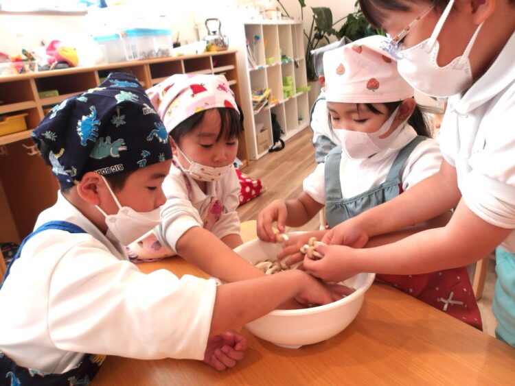 「お味噌って種類があるんだけど知ってる?」とみんなに問いかけると、「知ってるよ!赤味噌とかでしょ!」と知っていることを教えてくれる姿が見られ、「じゃあこれは何味噌か分かる?」と今日使う白味噌を見せると、「黄色味噌?」「茶色?」と不思議そうにお味噌を見ていました。