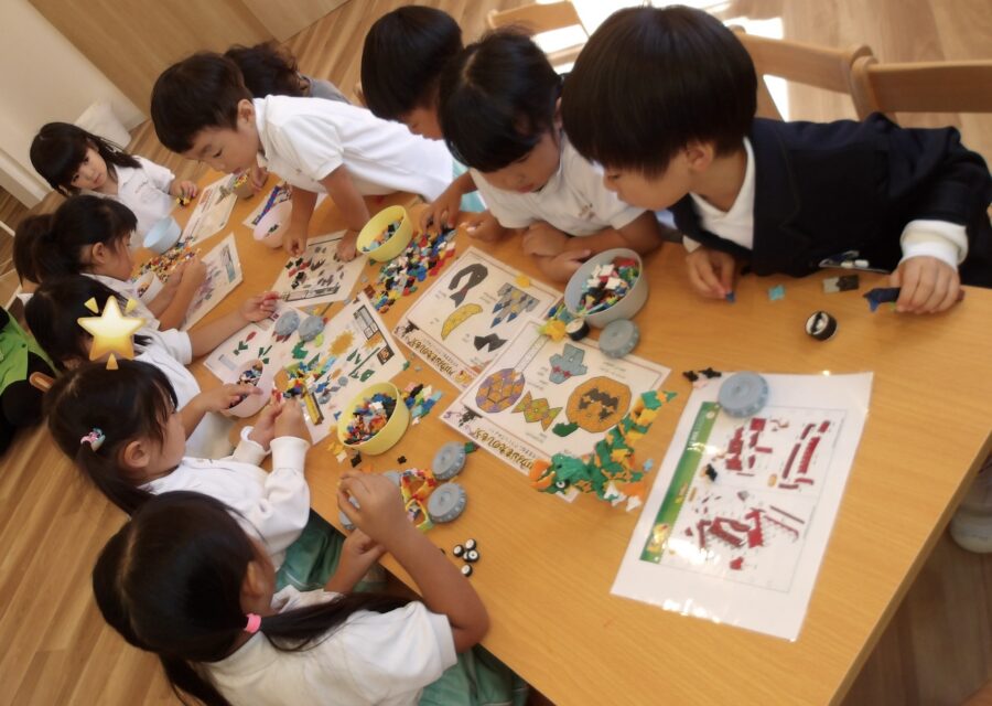 初めはつなげてあそんでいましたが、様々な形の作り方が登場すると、見本を見ながら夢中で作っていましたよ。