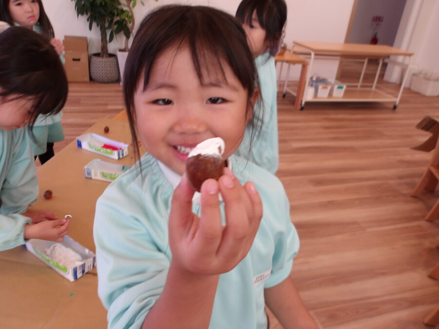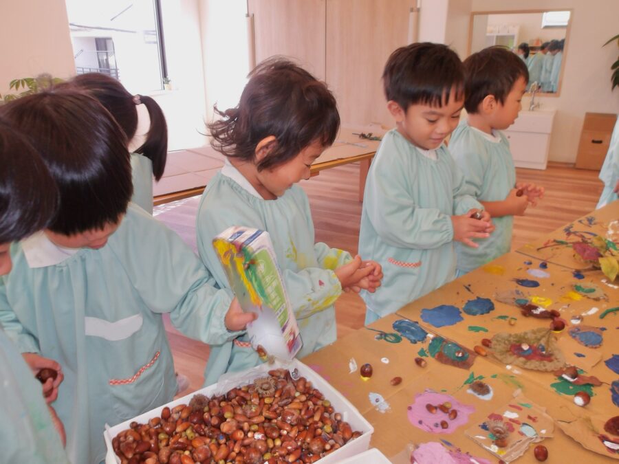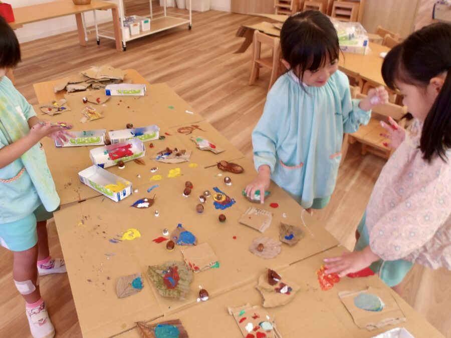 「クリームみたい!」と話しながらどんぐりを飾りつけていくうちに、ケーキのようなお菓子のような、かわいい作品ができあがっていきました。