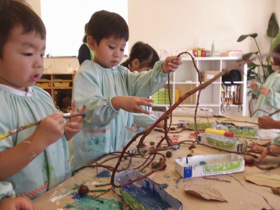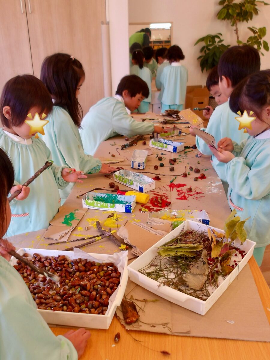 先日のピクニックや散歩先で拾ったどんぐりや枝で造形あそびをしました!