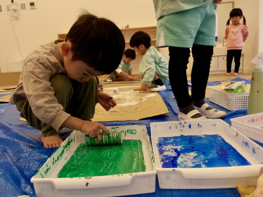 どんより曇り空だったので、今日はお部屋でダイナミックに絵の具あそびをすることに!