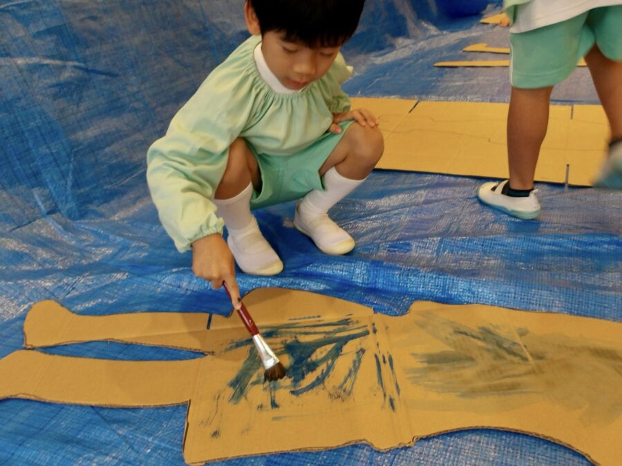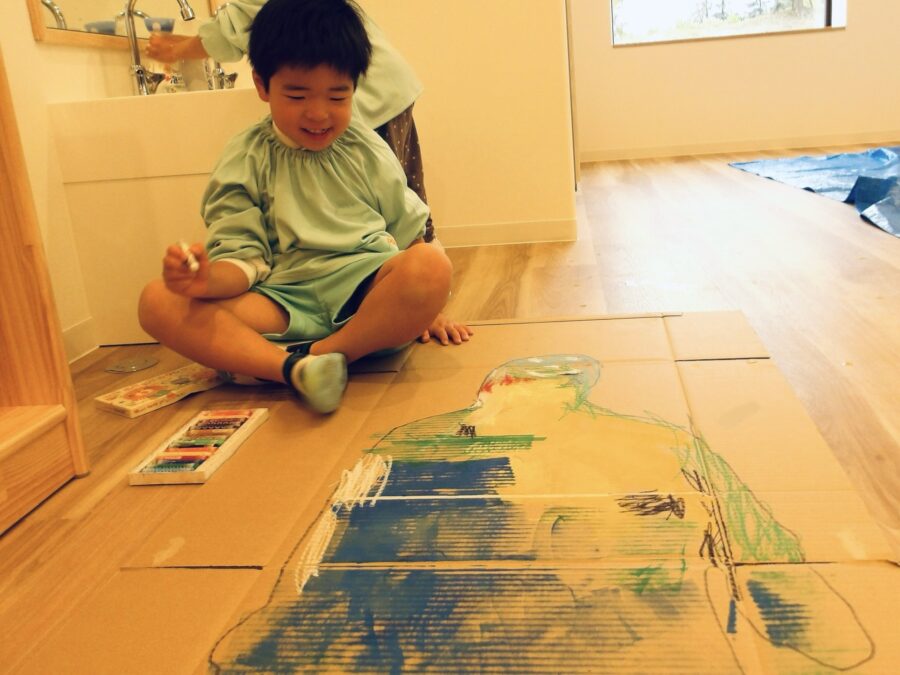 自分の姿をかたどったダンボールに、思い思いに色を重ねていきます。