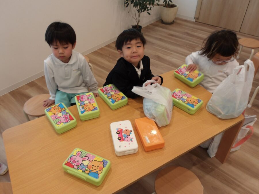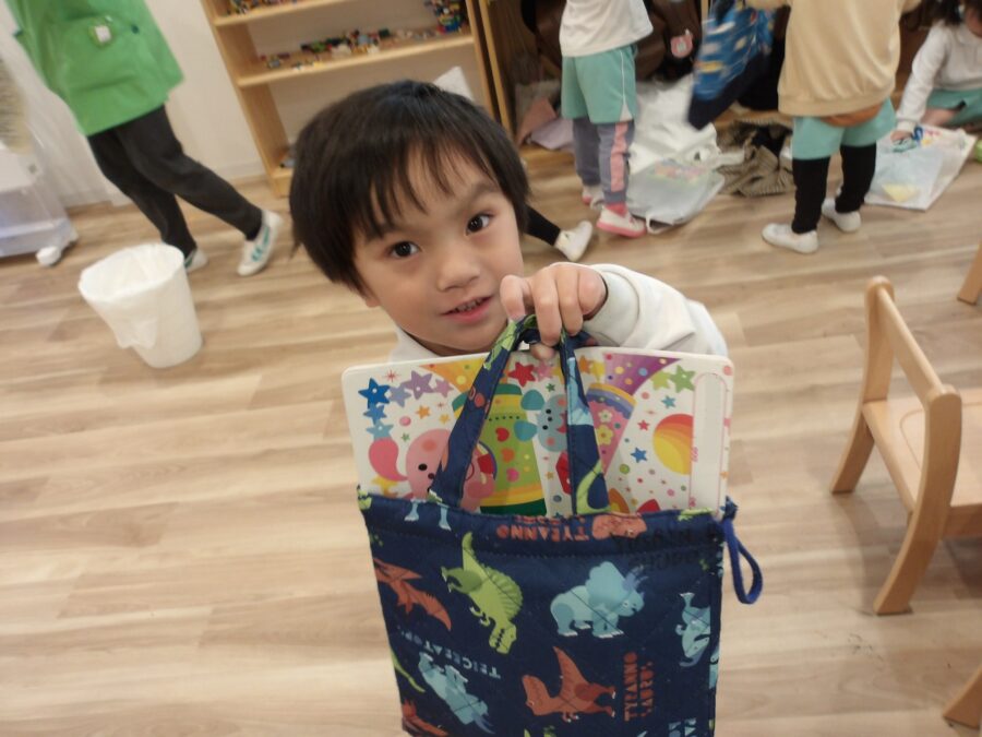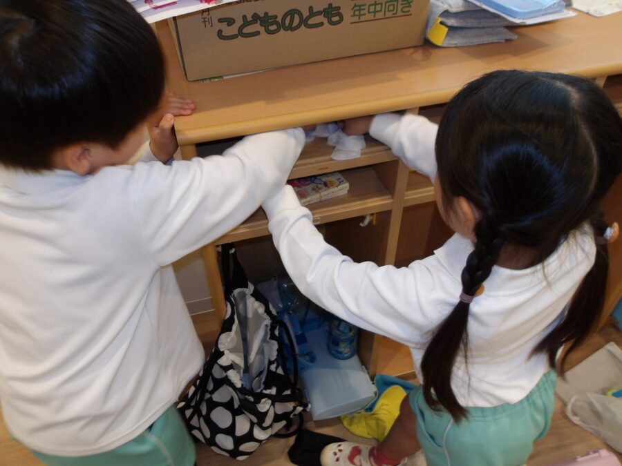 朝の会で保育者が話していた《持ち帰るもの》を思い出しながら、袋に詰めたり、お道具箱の中をきれいにしたり。