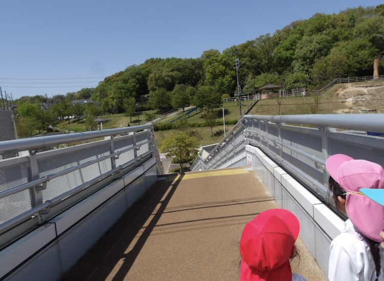 行き道の歩道橋の上から目的地の公園を眺めると、「わ!桜がなくなっちゃってる!大変!」と先週までは少しだけお花残っていた桜もすっかりと葉っぱだけになり、その変化に驚く子どもたちでした。