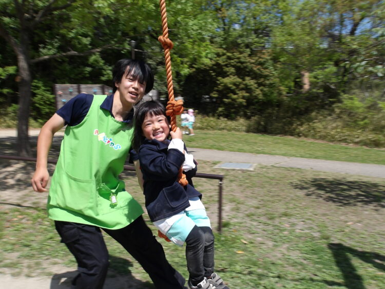 そら組は保育者にロープを支えてもらい、にじ・たいよう組は保育者に見守られながら1人でターザンロープを楽しみました。