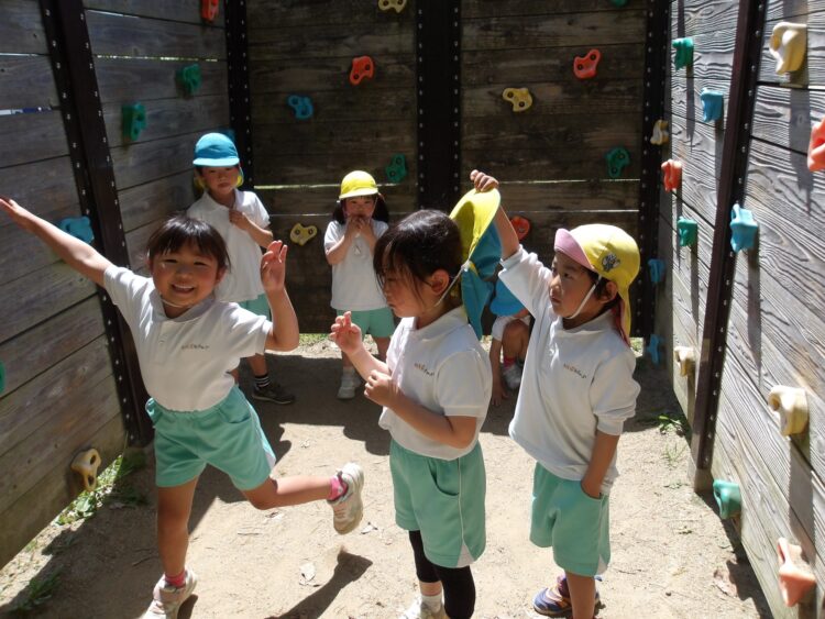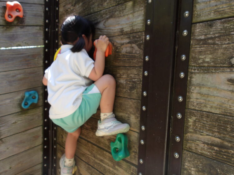 にじ・たいよう組はボルダリングの壁を《警察署》に見立てて、警察ごっこを楽しんでいました。