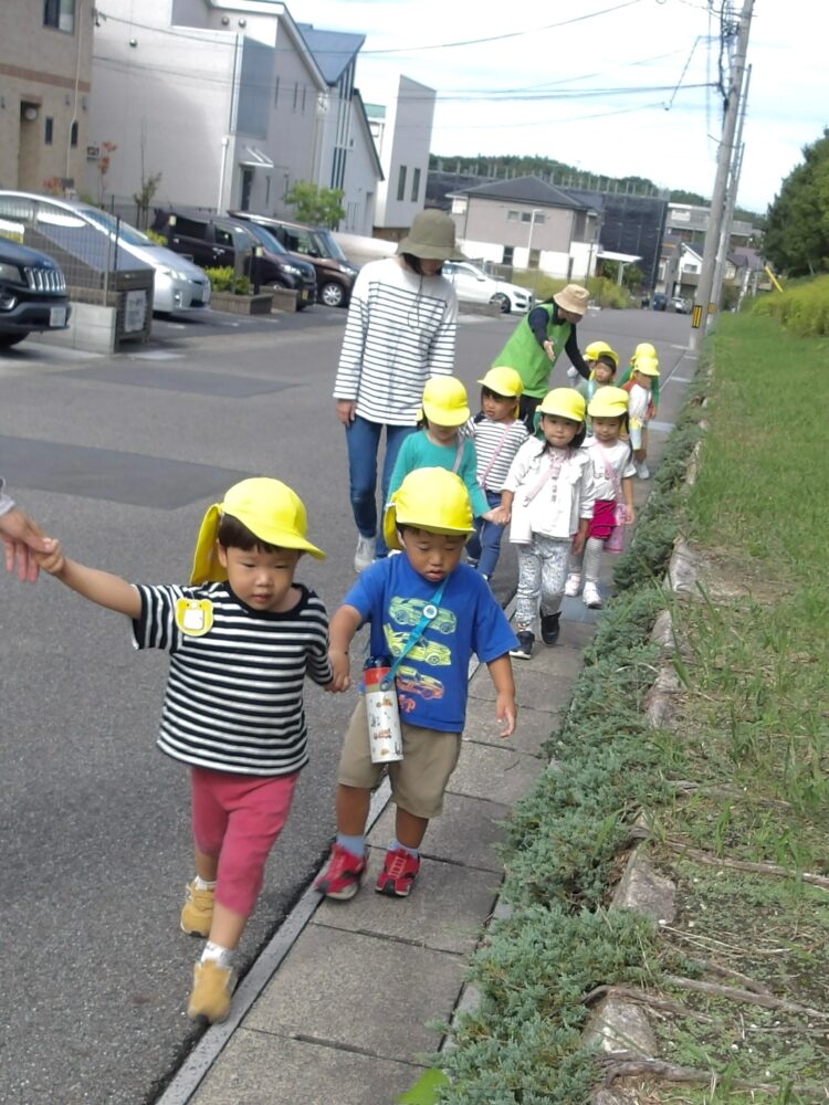 みんな自分の水筒を肩に下げて、お友だちと手を繋いでいざ出発!