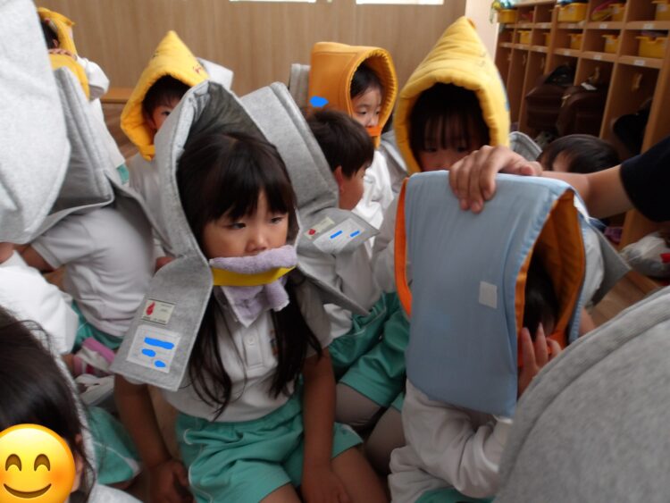 訓練のアナウンスが流れると皆んなしっかりと先生の元に集まり防災頭巾を被って頭を守っていました!