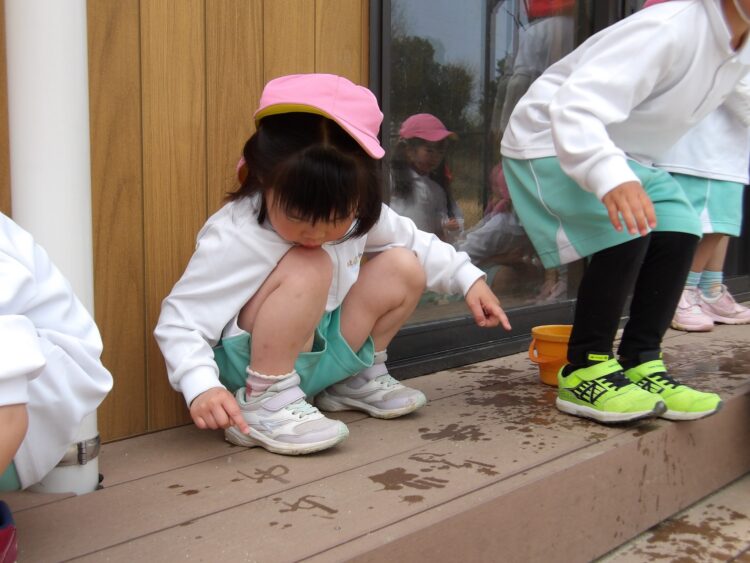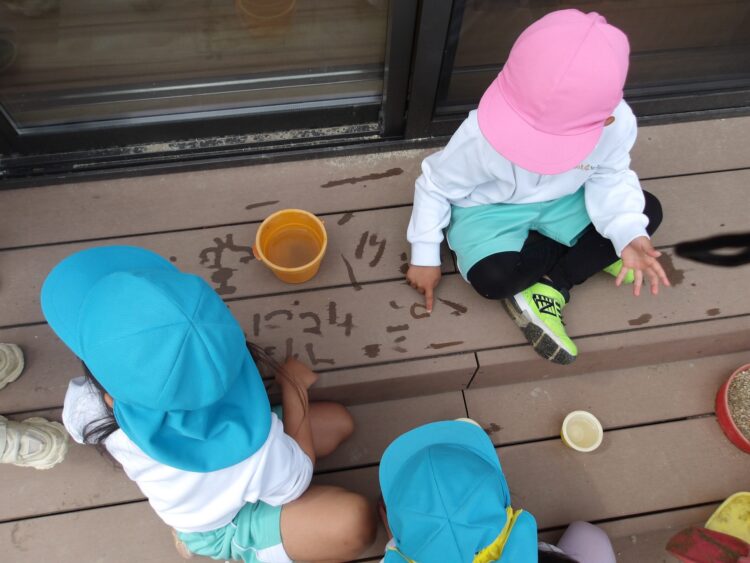 園庭の端っこでは、テラスに溜まった水で、板の色が違うことに気がついた子どもたち。