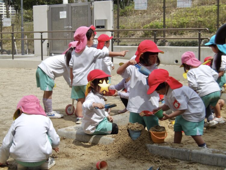 大人気の砂場では、川や池を作ろうと一生懸命掘り進める子どもたちの姿がありました。