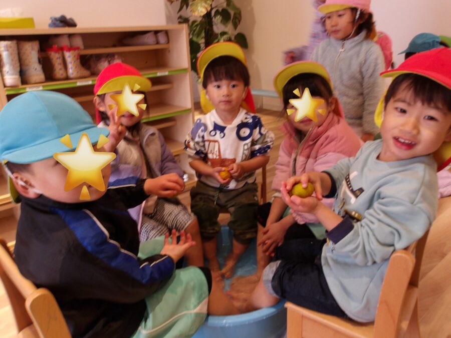 保育園で採れたみかんも浮かべて温泉気分です🍊