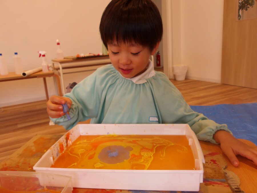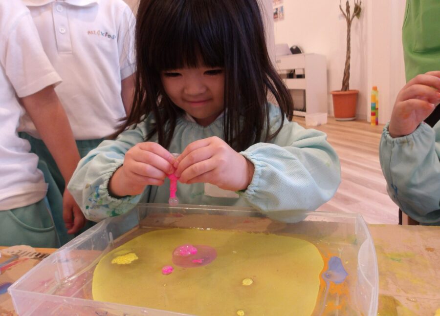 夢中でポタポタと絵の具を垂らす子どもたち。