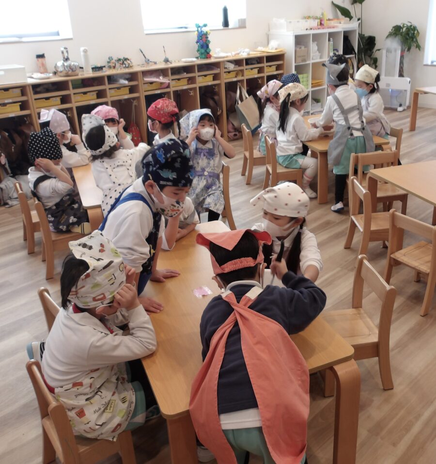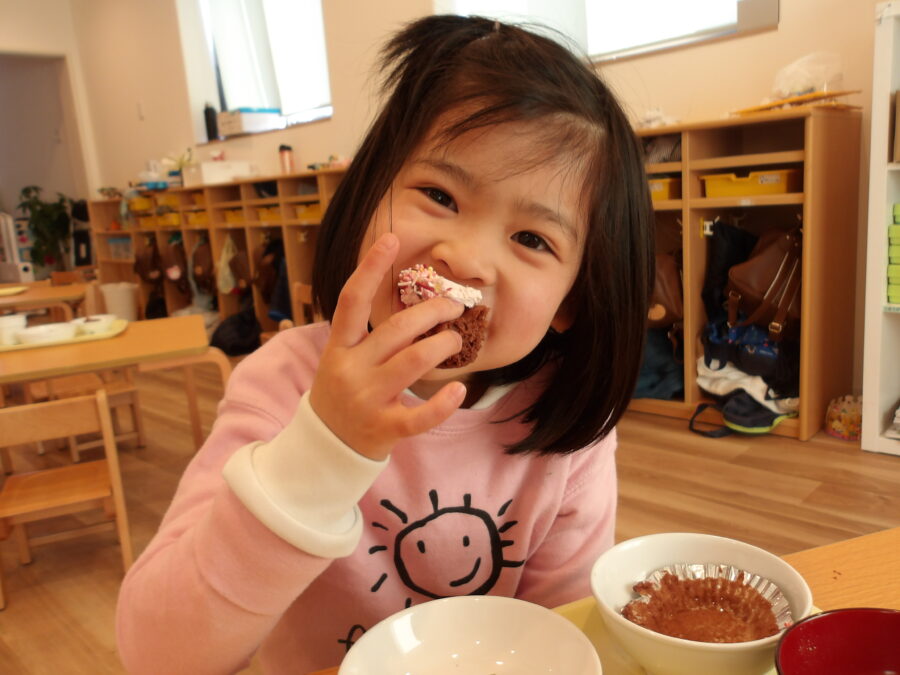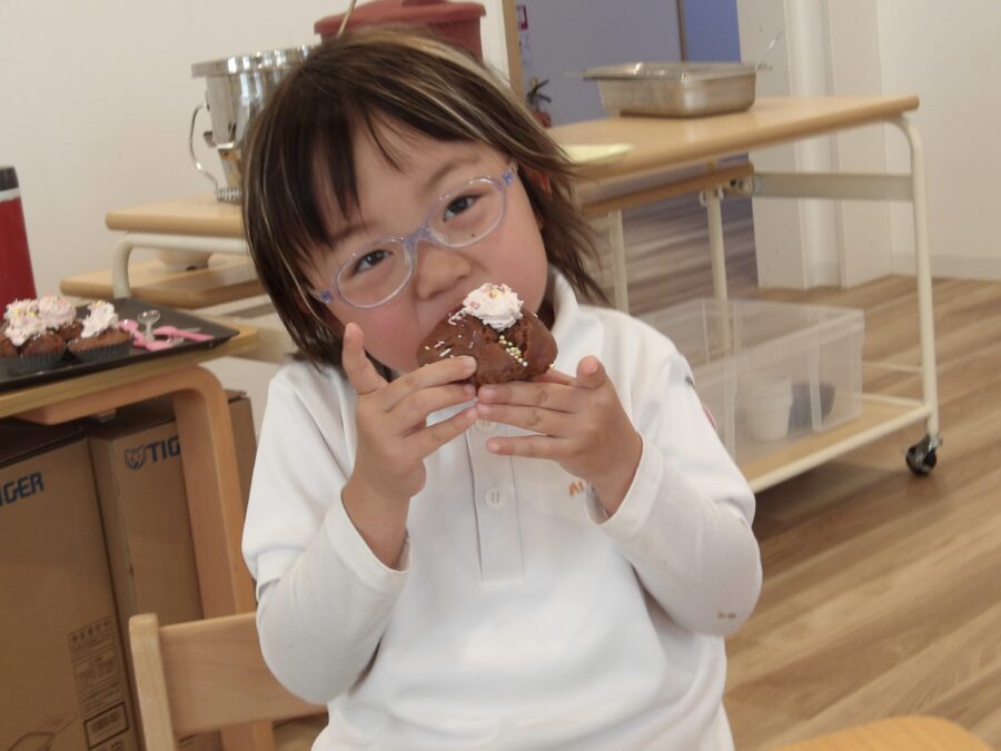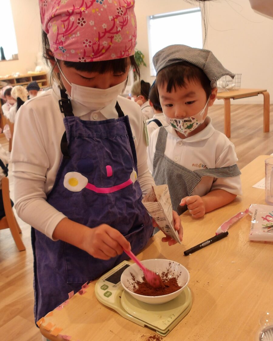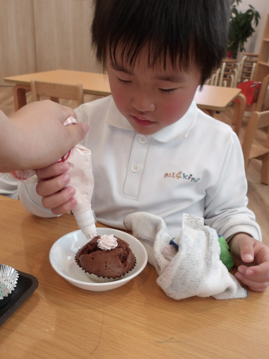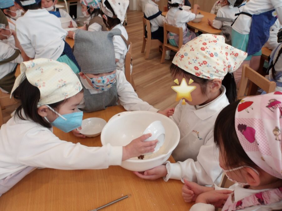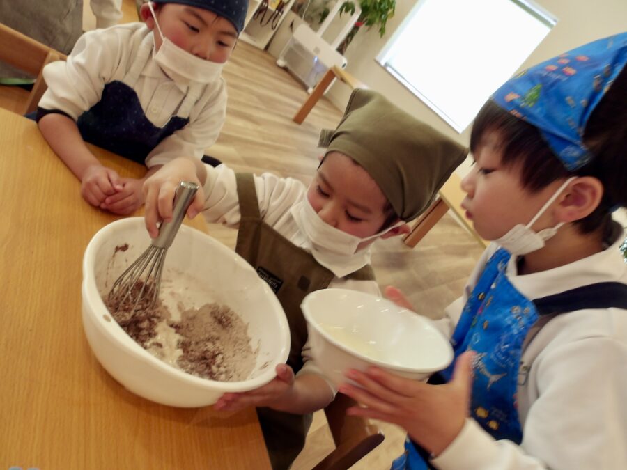 バレンタインにちなんで、ココア蒸しパンのカップケーキを作りました。くじで班決めをして、グループごとに協力して調理しましたよ。