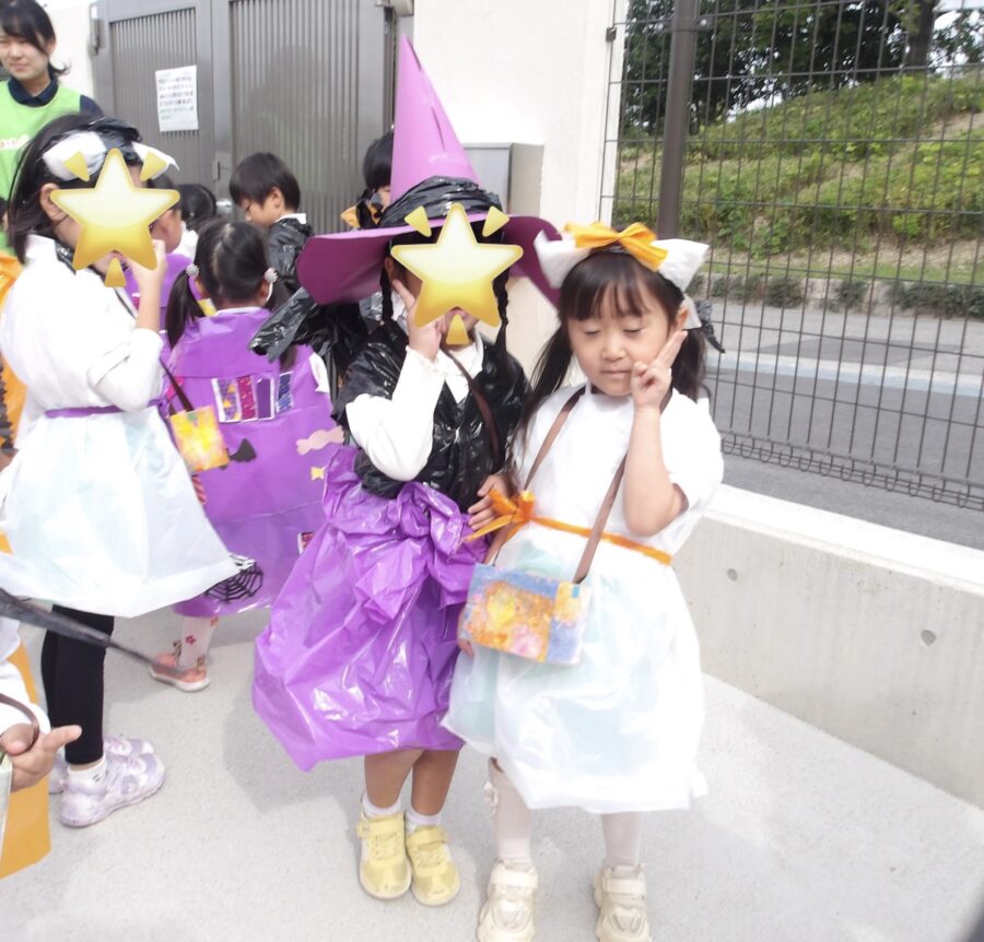 手作りの衣装とお菓子入れを持っていざ出発!