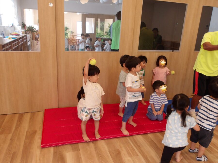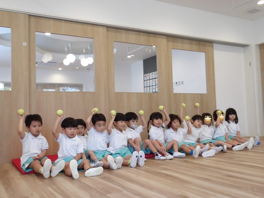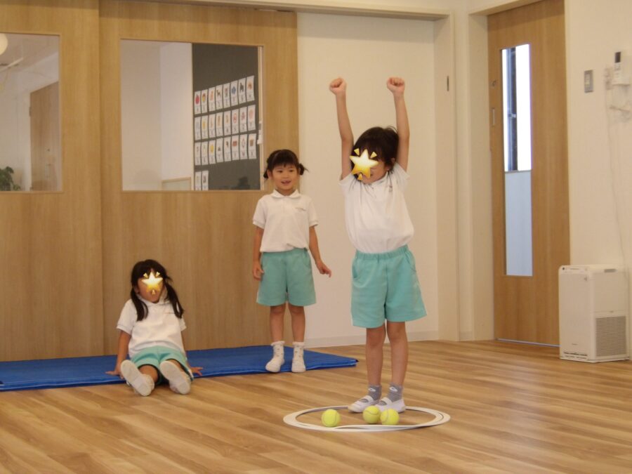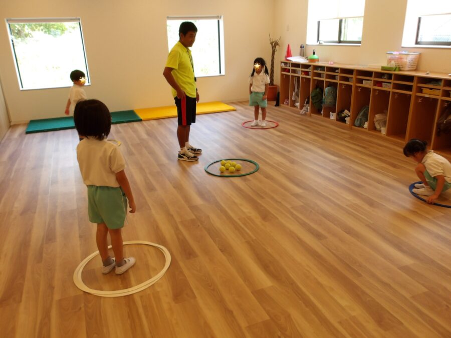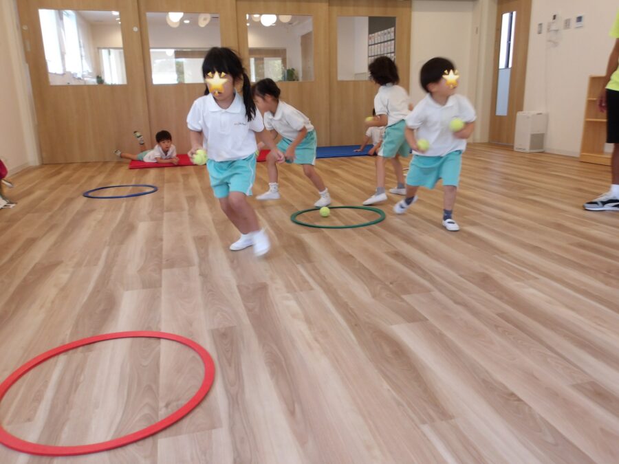 にじ・たいよう組は〈セブンボール〉というゲームであそびました。ボールを一つずつ持ち、自分の陣地(フラフープ内)に3つ入れることができたら勝ちです。
