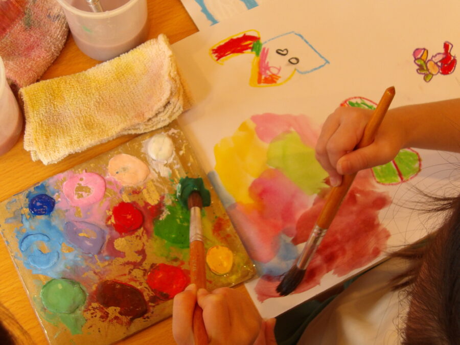クレヨンや絵の具パレットを使ったお絵描きも引き続き楽しんでいます。