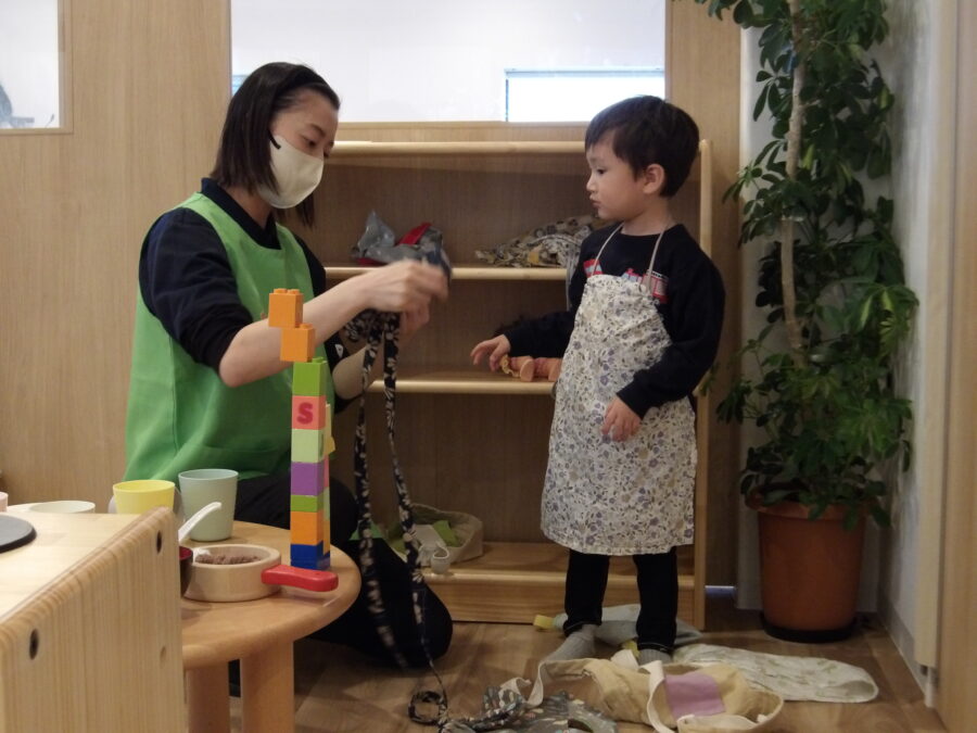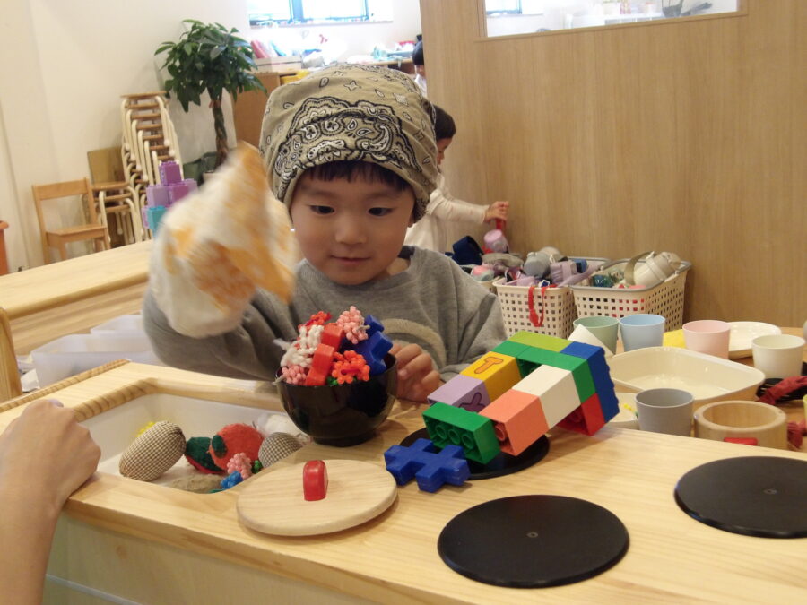 友だちがおままごとをする姿を見て、「僕も」と保育者と一緒にエプロンや三角巾を探す姿が。