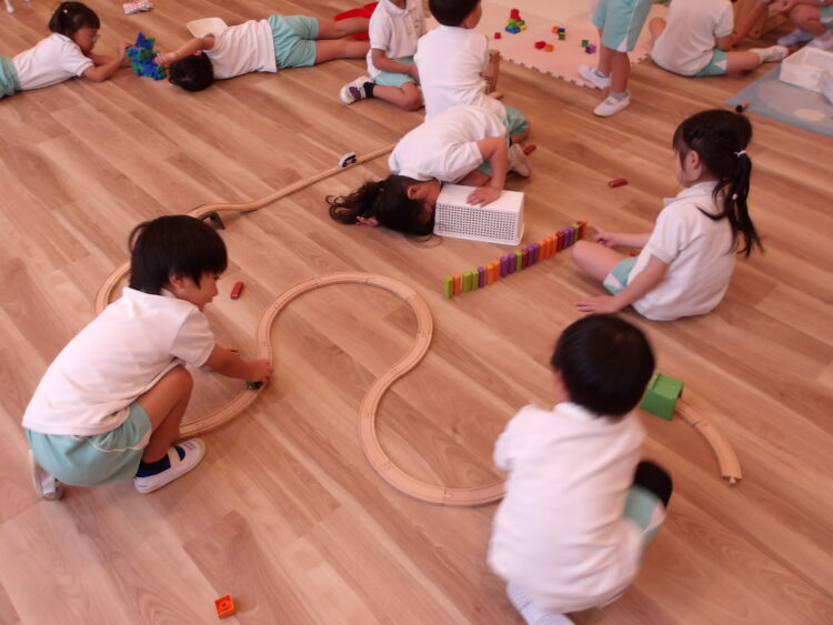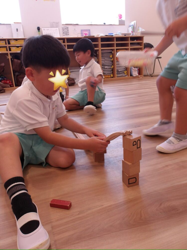 「先生こっち来てー!」と知らせて電車が走るところを見せてくれたり、「ピタゴラスイッチ♩」と呟きながら作ることを楽しんでいました。