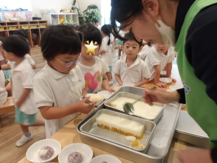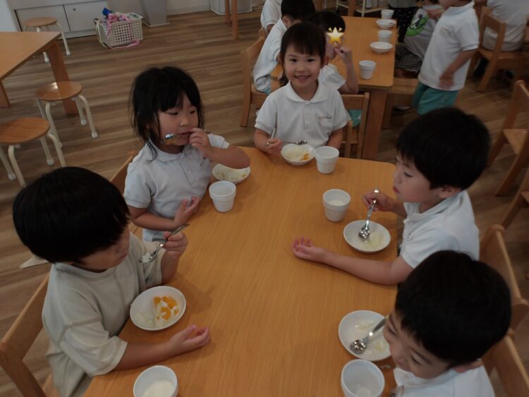 おやつの時間には、そら組が作ってくれたみかんミルク寒天をいただきました🍊