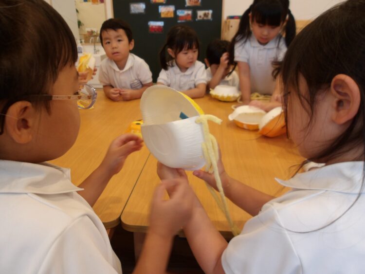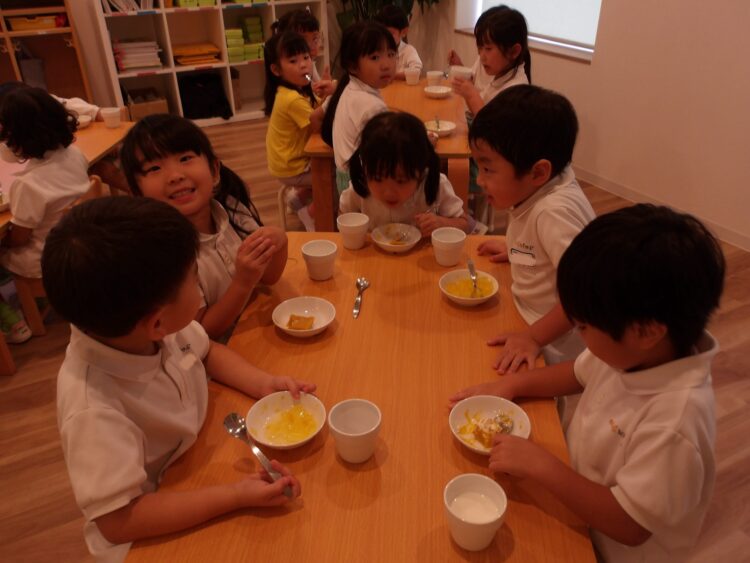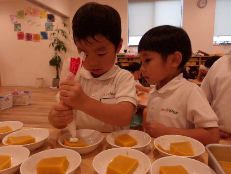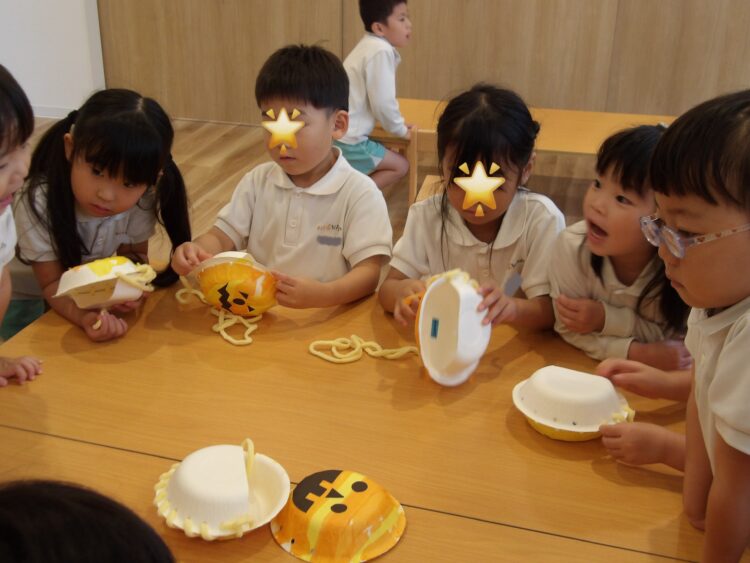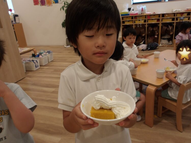 本日そら組がクッキングでかぼちゃプリンを作り、にじ・たいよう組さんもおやつでいただきました🍮