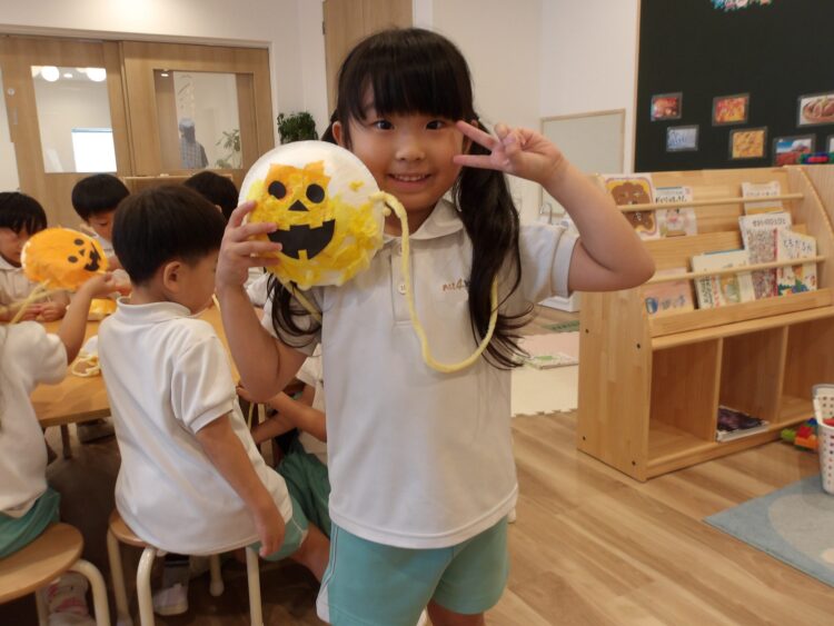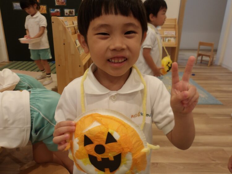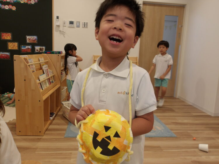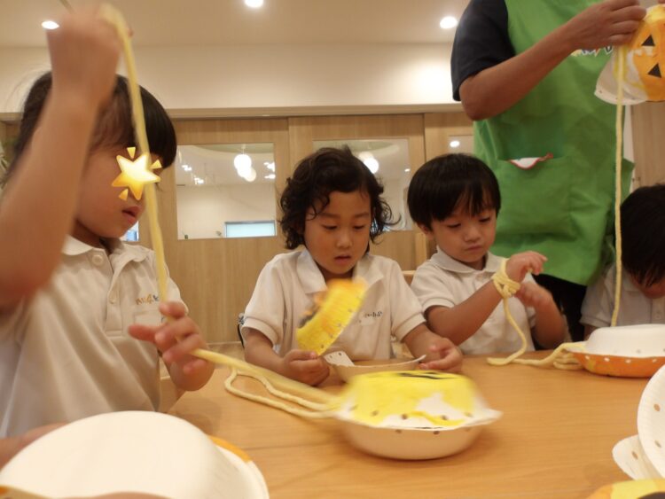 そら組がクッキングしている隣で、にじ・たいよう組は昨日のハロウィンバッグ作りの続きをしましたよ🎃