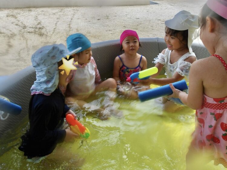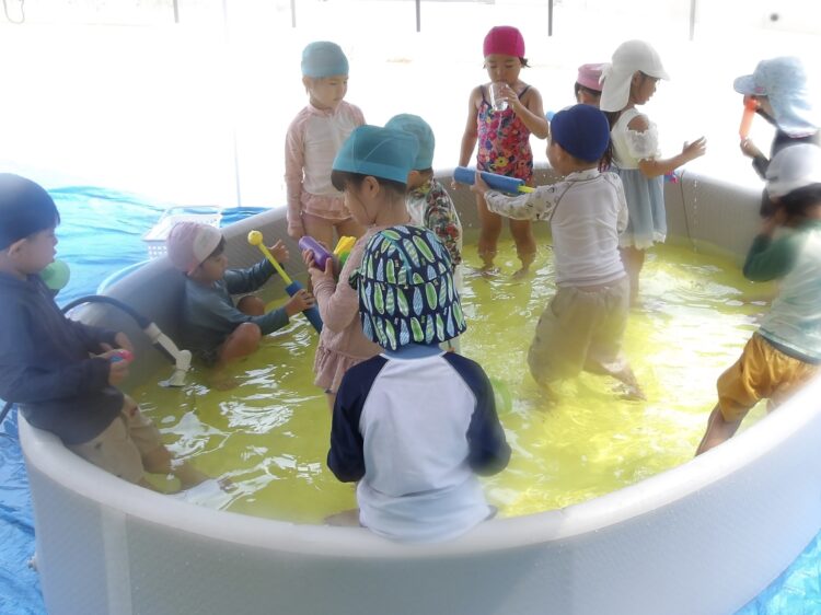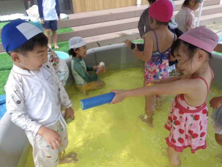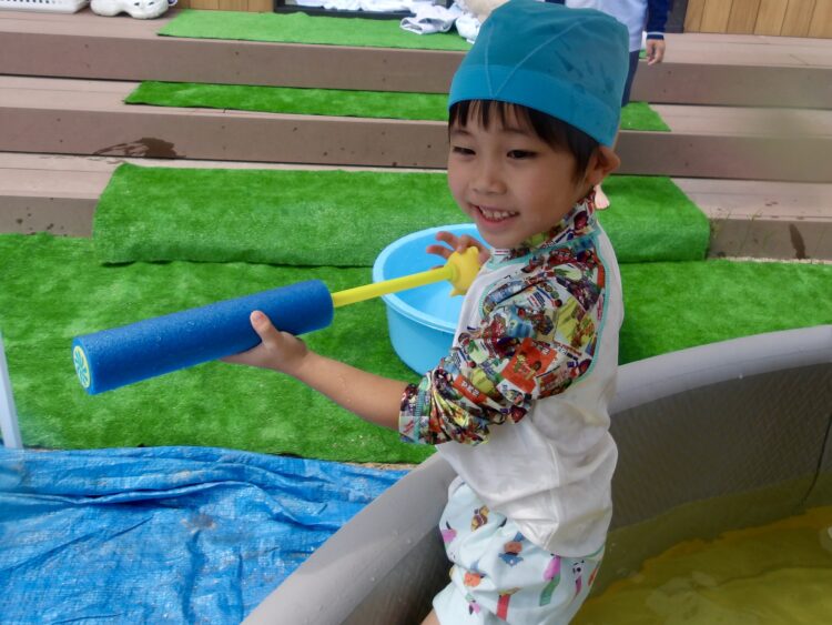 今日は新しくなった水鉄砲が大人気でした。すぐにコツを掴み、お友だちとぴゅー!と水をかけあっていましたよ。
