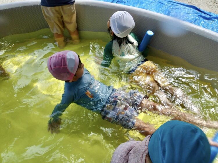 にじ組は水あそびをおこないました。プールでのびのびと浮かんだり泳いだり…気持ちよさそうですね!
